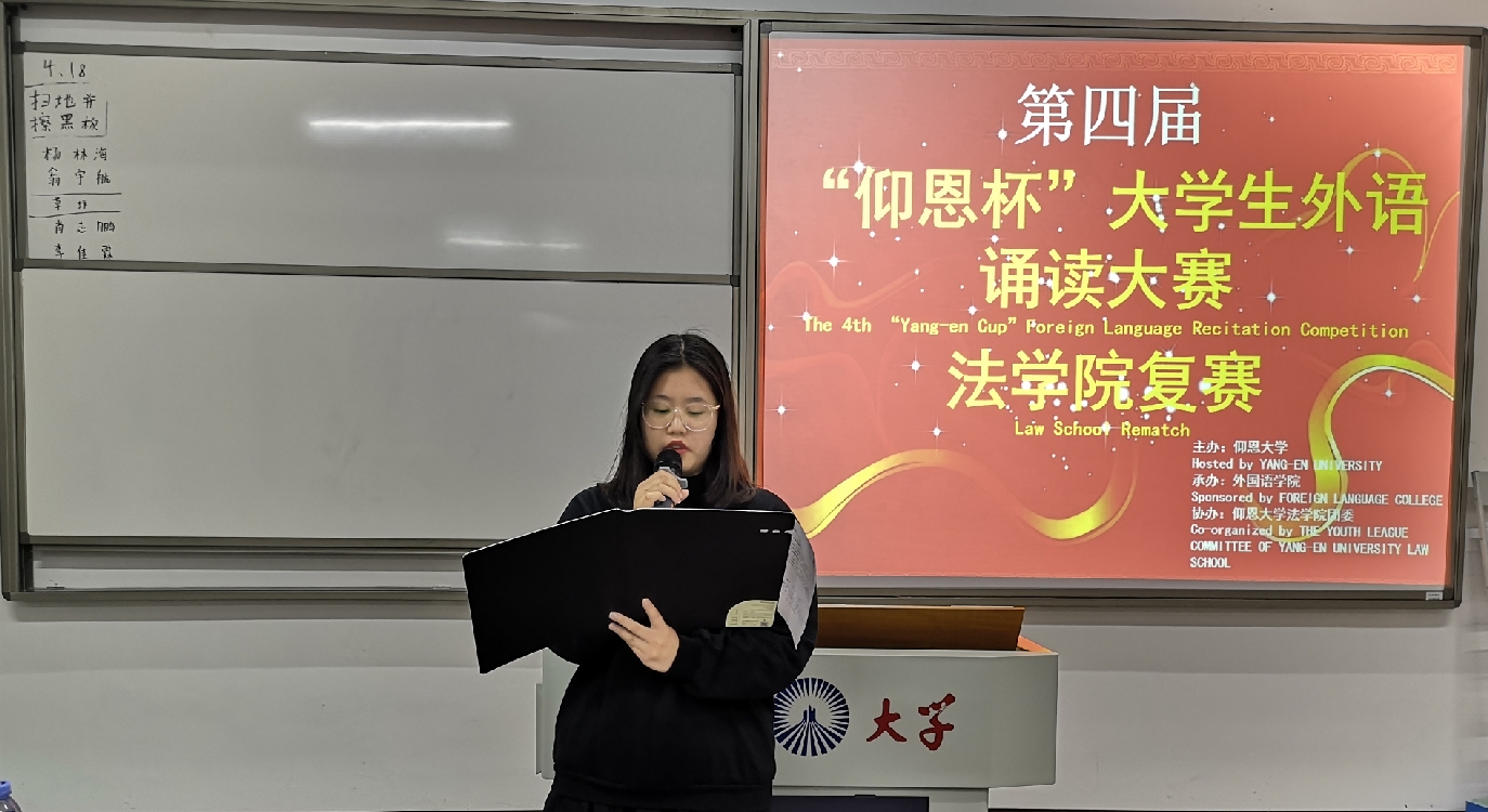 4月18日晚,由仰恩大学主办,外国语学院承办,beat365官方网站团委协办的第四届“仰恩杯”大学生外语诵读大赛beat365官方网站复赛于仰恩大学第三教学区普照楼204举行。外国语学院老师陈苗苗,梁正长担任本次比赛评委,beat365官方网站17级、18级学生参加了此次活动。