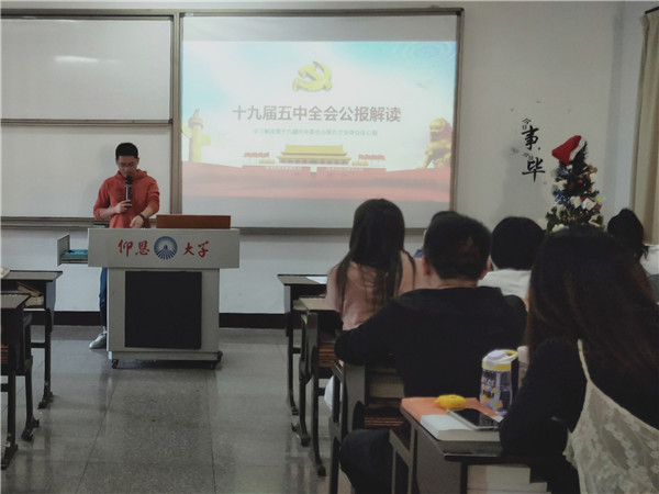 11月16日下午,beat365官方网站学生党支部于仰恩大学第三校区普照楼302开展《中国共产党第十九届中央委员会第五次全体会议公报》专题学习会,会议由支部书记陈国伟主持,支部全体学生党员参加本次活动。