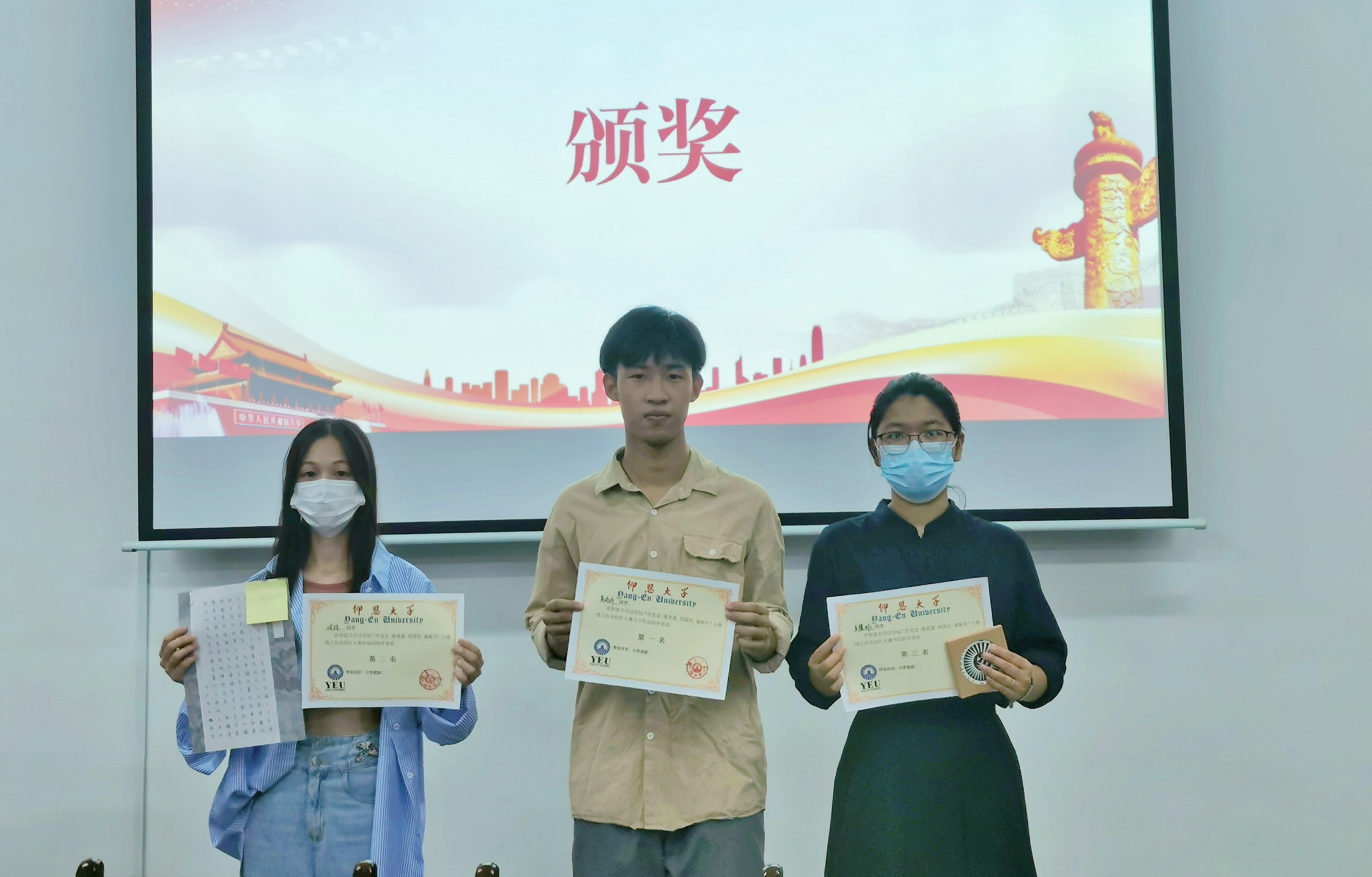 今年是中国共产党成立100周年,值此国庆之际,泉州疫情防控的关键时期,我院为丰富节日活动,活跃校园文化氛围,弘扬中华传统文化,开展本次主题为“学党史感党恩 贺国庆 谋振兴”的线上图文作品征集活动。10月3日下午,本次活动在普照楼法律诊所顺利落下帷幕并举行颁奖仪式,beat365官方网站党总支书记杨勤老师和beat365官方网站辅导员李斯滢老师出席本次活动担任评委。