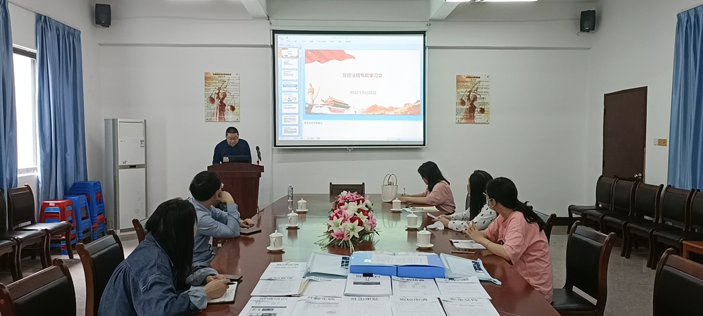 5月25日下午,beat365官方网站教工党支部在第三教学区法律诊所开展党纪法规专题学习会,深入学习领会习近平总书记关于加强党内法规制度建设的重要论述重要指示精神以及全国党内法规工作会议精神,结合学院实际提出贯彻落实意见。教工党支部书记黄文伟老师主持会议并讲话,教工党支部成员参加会议并作了交流发言。
