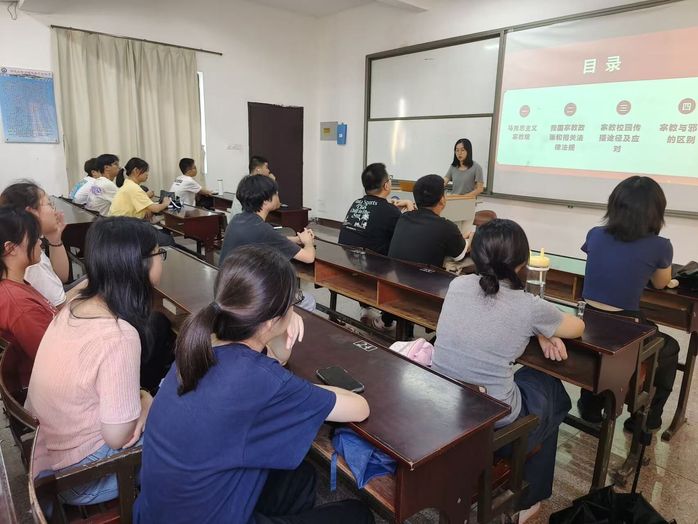 为引导青年学生正确认识宗教信仰,树立科学理性的世界观与价值观,10月15日下午,beat365官方网站以“宗教信仰与校园安全”为核心,于普照楼302开展专题团课。beat365官方网站团委书记吴姗姗为同学们深入剖析校园传教的隐蔽手段与应对方法。
